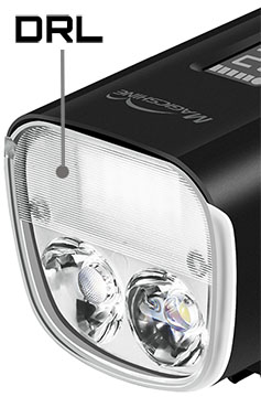 DRL (Daytime Run Light) je horní reflektor s širokým kuželem přímo vyvinutý pro použití za dne, výrazně zvyšuje bezpečnost cyklisty na silnicích. DLR má nízký odběr z baterie a svítí výkonem 25 lumen. Hlavní spodní reflektory: levý (úhel 18°) pro svícení do dálky a pravý (úhel 25°) do široka pak vytváří silný kužel světla dobře rozprostřeného jak na blízko, tak do dálky. Navíc je po stranách malý průzor pro viditelnost ze stran. Tyto reflektory jsou osazeny dvojicí špičkových led Luminus SST-40 s reálným výkonem až 2500 lumen.