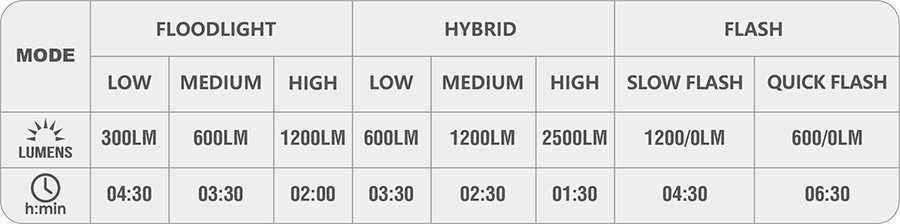 Svítilna disponuje dvěma módy svícení Floodlight (reflektor do široka + DLR) nebo Hybrid (oba reflektory + DLR). 3 intenzity světla pro každý mód. Dále je v nabídce režim klasické blikačky také ve 2 intenzitách, opět společně s aktivovaným DLR. Mimo přednastavené režimy má uživatel možnost připojit k mobilnímu telefonu a přes APP nakonfigurovat intenzity svitu, pořadí režimů a další nastavení dle svých preferencí, paměť má až na 20 nastavitelných uživatelských módů. Svítilna má paměť na poslední zapnutý režim a tak máte svůj oblíbený režim vždy ihned k dispozici. Kromě manuálního módu svítilna nabízí také SMART mód. Senzor pohybu v AUTO módu indikuje pohyb kola a při zastavení delší než 5 min přejde do stand-by režimu. Při obnovení pohybu ihned automaticky opět aktivuje svícení. Toto řešení výrazně šetří baterii a zjednodušuje ovládání. Dále je ve svítilně integrován světelný senzor, který vyhodnocuje okolní světelné podmínky a sám přizpůsobí režim svícení. Časy výdrže svícení pro přednastavené režimy jsou uvedeny na obrázku.