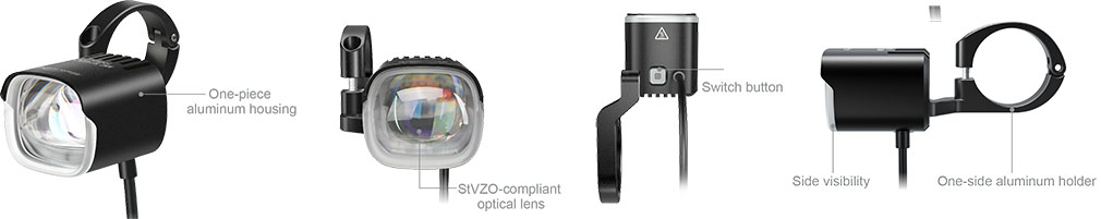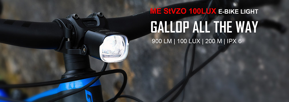 ME StVZO je výkonná cyklistická svítilna specielně vyvinuta pro elektrokola s napájením 6-36V (Bosch, Shimano,Brose, Yamaha) a s možností napojení přes konektor jack, nebo přímo na motor. Nabízí výkon až 100lux (900 lumen). Díky speciální optické čočce je ME StVZO zejména vhodná pro městské nebo silniční využití, kde je žádoucí zabránění oslnění ostatních účastníků provozu.