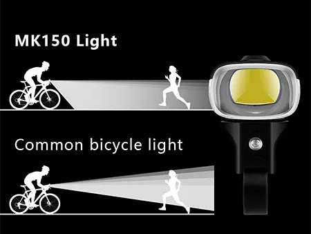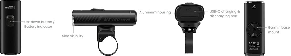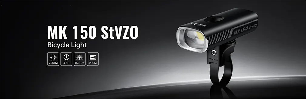 MK150 nabízí výkon až 150 Lux (700 Lumen) s napájením na interní USB-C dobíjecí baterii. Díky speciální optické čočce je MK150 zejména vhodná pro městské nebo silniční využití, kde je žádoucí zamezení oslnění ostatních účastníků provozu.