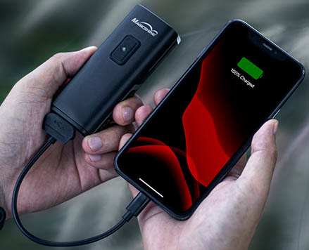 Světlo má integrovaný akumulátor Li-Ion o kapacitě 6700mAh, který zvládá svítilnu napájet téměř 7 hodin v režimu 600 lumen! (nebo také např. přes 14 hodin na 300 lumen). Dobíjení je zajištěno pomocí integrovaného USB-C portu a nabíjet je možné z USB 5V zdroje, doporučen je výkonný USB adaptér do sítě s podporou rychlonabíjení. Baterie je plně nabitá za 3h a průběh nabíjení i ukončení nabíjení je indikován led diodami. Svítilna zároveň slouží i jako powerbanka k dobíjení např.mobilního telefonu nebo Garminu za jízdy (k tomu slouží obousměrný USB-C kabel, který je součástí balení). O stavu baterie informuje 2 barevný led indikátor (zelená 100-31%, červená 30-11%, červené blikání 10-0%), takže se nestane že vyjedete s vybitou baterií.