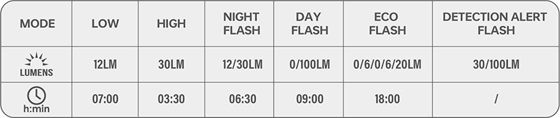 Výdrž svícení je až 18 hodin* v EcoFlash režimu nebo až 9 hodin* v denním režimu (nejpoužívanější). Režimy, výkony světla a výdrže jsou uvedeny v tabulce níže. Funkce světla nabízí široké možnosti využití - pět režimů svícení a blikání, denní a noční mód. Světlo disponuje i moderním a ohleduplným režimem Night Flash pozvolné pulzní blikačky bez strobo efektu.