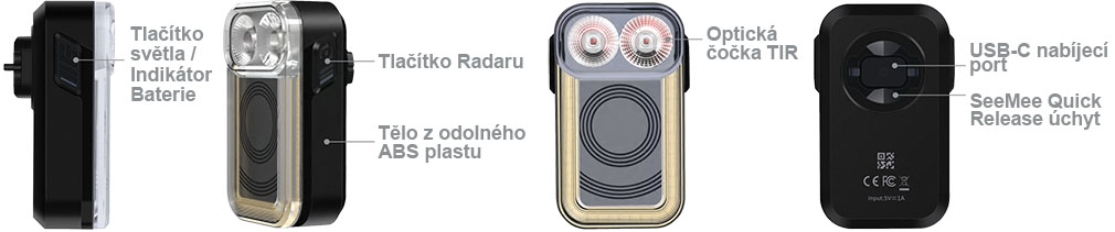 V balení jsou 2 držáky - na sedlovku i pod sedlo, uživatel si může vybrat kam chce světlo upevnit. Uchycení do držáku osvědčeným systémem Seemee Quick Lock Release (podobný systém jako u Garmin). Oba tyto držáky lze také zakoupit zvlášť např.pro další kola v rodině. K dispozici je také klip na batoh/opasek a radarové světlo tak používat i pro další aktivity mimo kolo.