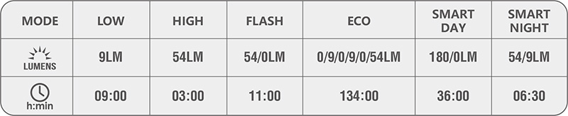 Výdrž svícení je díky velké kapacitě dobíjecí baterie vynikající - až 134 hodin v denním režimu nebo 11 hodin v klasickém režimu blikačky. Režimy, výkony světla a výdrže jsou uvedeny v tabulce níže. Funkce světla nabízí široké možnosti využití - šest režimů svícení a blikání, denní a noční mód. Světlo má speciálně konstruovanou čočku reflektoru (lámající světlo jak doširoka tak do dálky), která zvyšuje efektivitu světla a tím i úsporu baterie.