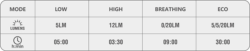 Výdrž svícení je přes 30 hodin v ECO režimu nebo např. 9 hodin v ohleduplném režimu Breathing pulzní blikačky. Režimy, výkony světla a výdrže jsou uvedeny v tabulce níže.