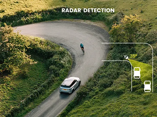 Radar detekuje zezadu blížící se vozidla (včetně skůtrů, motocyklů a dalších) na vzdálenost až 140 metrů za cyklistou. Horizontální úhel detekce je až 35° (vertikální 45°), to znamená dobrou detekci vozidel i v zatáčce. Detekuje až 8 vozidel jedoucích za sebou najednou. Radar komunikuje bezdrátově (ANT+) s kompatibilním cyklokomputerem (např.Garmin, Wahoo, nebo sportovními hodinkami), který blížící se vozidla zobrazuje na displeji a provází upozornění i zvukovým signálem.